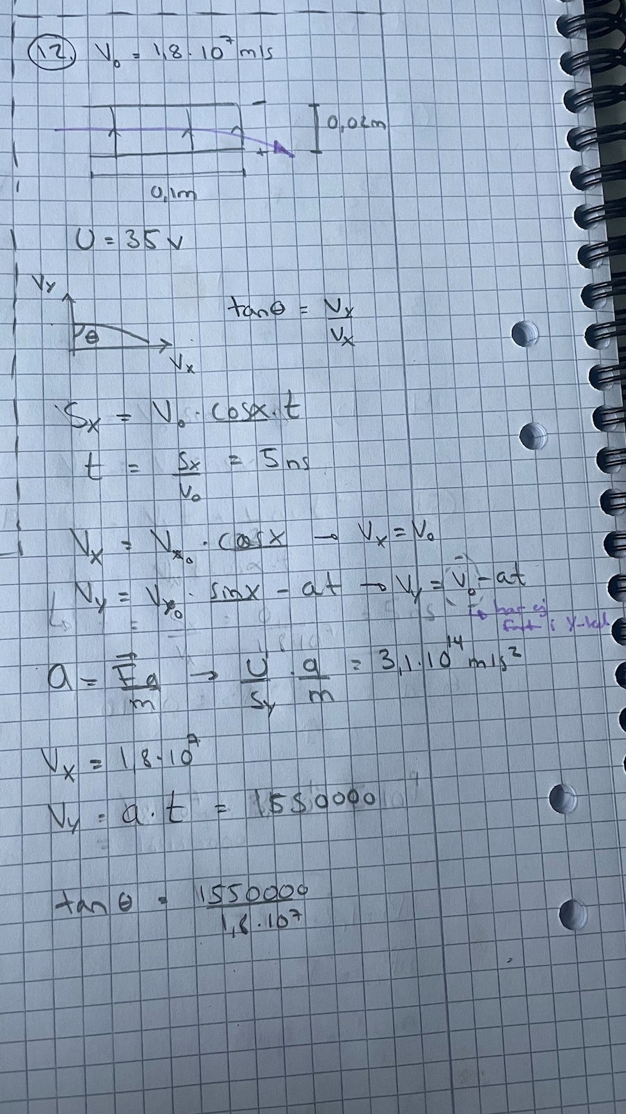 jag har gjort såhär men får fram fel svar så nånstans har det gått fel. Jag har tänkt mig att först få fram ett tiden genom formen för sträckan i x led. Tiden kommer jag sen behöva för att räkna ut hastigheten i y led. Sen fick jag fram ett värde på accelerationen i y led. Sen tänkte jag mig att trigometri skulle användas för att beräkna vinkeln. Vart har jag gjort fel?