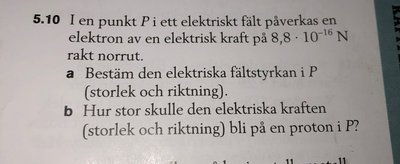 I uppgift a blir svaret 5,5kN/C rakt söderut. Fältstyrkan är ju riktad åt det håll som en positiv laddning skulle röra sig, förstår dock inte hur man vet det då vi bara har 1 laddning (inga metallplattor). Dessutom ska fältstyrkan ha samma riktning som den elektriska kraften på en positiv laddning i fältet (vilket tydligen är norrut, förstår dock inte hur man vet det i detta fall). Men då kan ju inte fältstyrkan vara riktad söderut eftersom den elektriska kraften är riktad norrut?