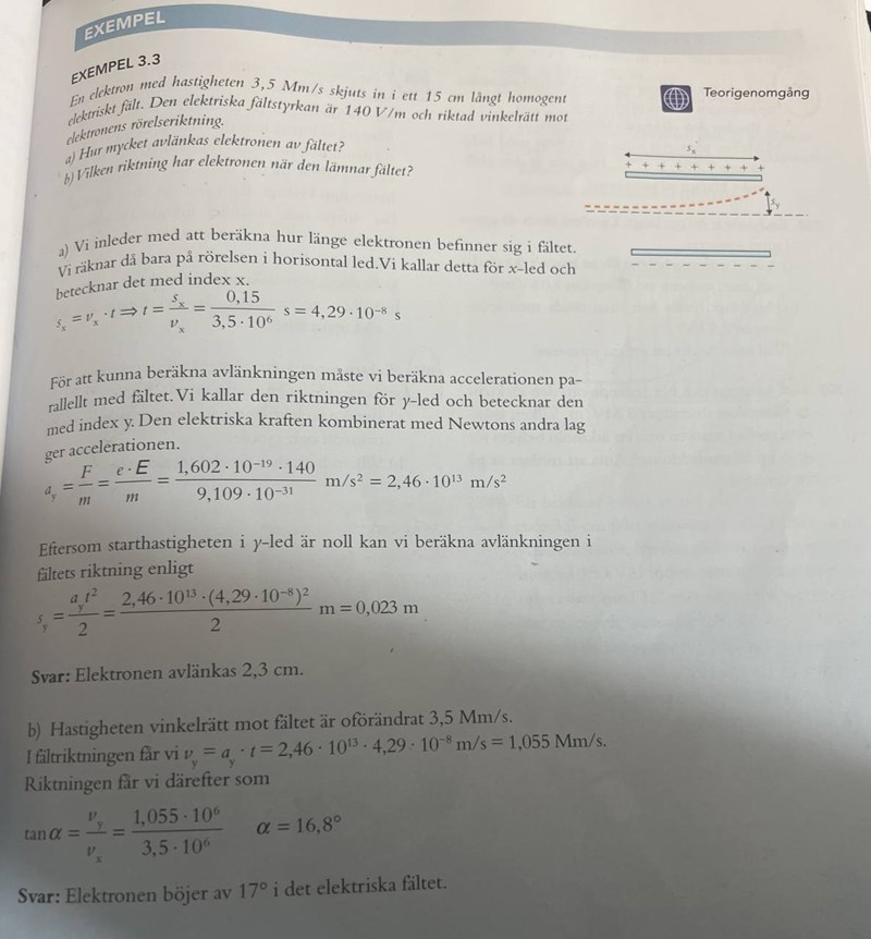 I frågan som står ovan utgår man ifrån att den resulterande kraften är lika med kraften som verkar på elektronen, alltså f=m*a=q*E och utifrån det räknar man (a) i yled.