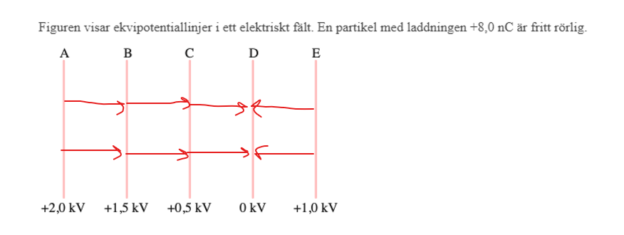 Men i första exemplet kommer partikeln först gå mot fältets riktning (E till D). Utförs inte ett positivt arbete då? Och hur tänker du när du löser frågan? T.ex. att med fältlinjernas riktning ger ett positivt arbete och mot fältlinjernas riktning ger ett negativt arbete? Tvärtom för en negativt laddad partikel.