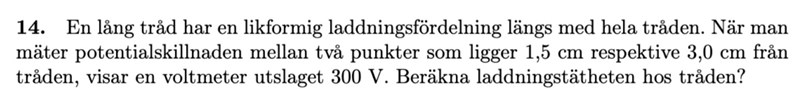 I lösningen till denna uppgift tillämpar de Gauss lag, man konstaterar först att elektriska fältet är i radiell riktning och att. där A1 och A2 är sidytorna medan Am är mantelarean. Jag undrar dels varför det elektriska fältet är i radiell riktning, är det för att tråden har en likformig laddningsfördelning? Sedan undrar jag varför de elektriska fältlinjerna är vinkelrät mot sidytorna och parallell mot mantelarean, jag tänker att radiellt riktade fältlinjer har sin mittpunkt längs med trådens mitt och att fältlinjerna då riktas utåt i alla riktnignar vilket gör att fältlinjerna är vinkelräta mot mantelarean och parallella med sidytorna.