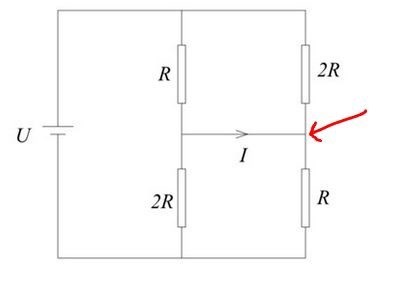 spänningen mellan den röda pilen och batteriets minuspol är därför U/2.