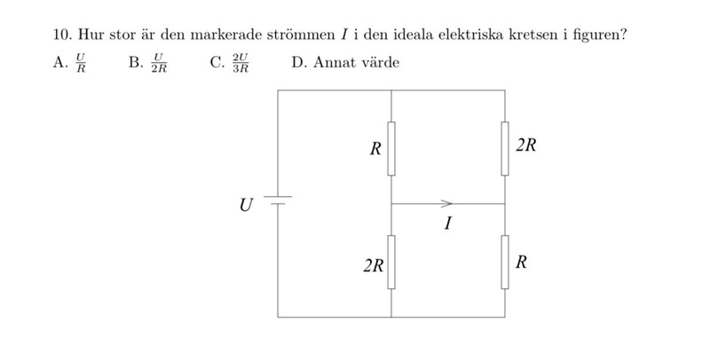 Då kan du med hjälp av ohms lag beräkna strömmen genom vardera motstånd i kretsen, alla har ju spänningen U/2 över sig.