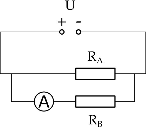 Två resistorer kopplas parallellt till en spänningskälla med polspänning 2.3 V. En amperemeter kopplas i serie med resistor B, enligt figuren. Amperemetern visar då 230 mA.