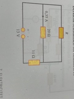 Ett resistor R med okänd resistans samt två andra resistorer är anslutna till en spänningskälla med polspänningen 13 V, se figur. Strömmen genom resistorn med resistansen 20 Ohm är 0,35 A. Beräkna resistansen för resistorn R.