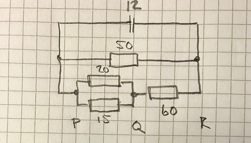 Men Hansa tog en genväg som man kan se när man är van att räkna på spänningar och strömmar. Eftersom det flyter samma ström mellan P och Q, som mellan Q och R, så kommer spänningen mellan P och R (12 V) att fördela sig på det sättet han skriver.