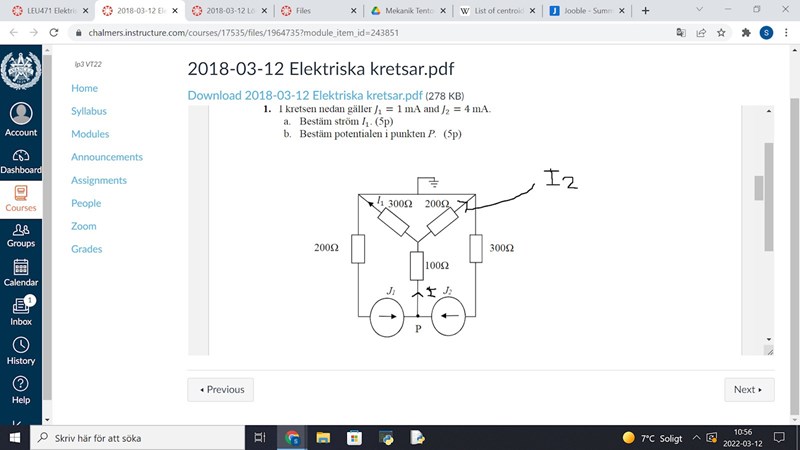 Jag ritade in I2 och I för att tydliga göra, det jag undrar är varför man väljer att använda I*100 + I1*300 för att beräkna potentialen i punkten P? Innan jag kollade på lösningsförslaget tänkte jag att man istället skulle räkna med följande: I1*200 + I2*300 men det blev fel. Varför väljer man just I1 och I?