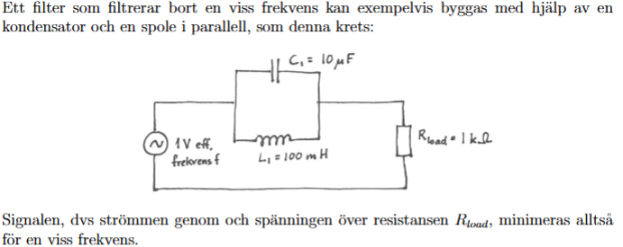 Jag är inte riktigt med på hur detta fungerar. Jag antar att man tänker att spänningskällan alstrar en spänning som kan anses vara en summa av sinusoidala och kosinusoidala kurvor. Varje sådan kurva har då generellt en egenfrekvens . Så jag antar att då strömmen passerar "filtret" så dör komponenter av vissa (egen)frekvenser ut så att den effektiva signalen inte har dessa komponenter i sig. Men hur funkar det i den här kretsen? Varför dödas vissa delar av insignalen?