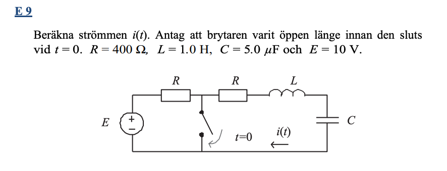 Om brytaren har varit öppen "länge" så är kondensatorn uppladdad till spänningen E och det flyter inte längre någon ström i kretsen. Detta är tillståndet som gäller fram till tiden t=0 då brytaren sluts.