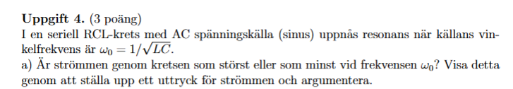 Jag har två frågor om denna fråga. Den första är: vad menas ens med huruvida strömmen är störst eller minst vid den frekvensen? Det är ju en växelström så hur mycket ström som går genom kretsen varierar väl med tiden?