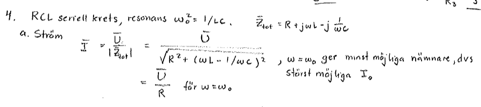 Då måste hon ha slarvat med det formella i facit. Om U-tak och I-tak är de komplexa uttrycken för strömmen och spänningen i det generella fallet så kan inte sambandet mellan dem beskrivas med en reell konstant. Vi har ju just lärt oss att det finns en fasskillnad mellan strömmen och spänningen eftersom impedansen är komplex. Utom just i resonansen, då impedansen är reell.