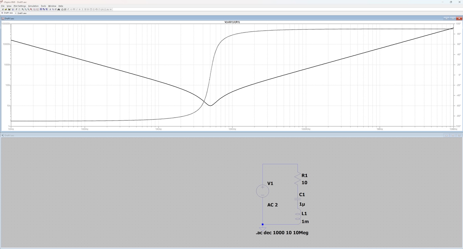 Jag gjorde en snabb simulering av RLC-kretsens impedans för några "normala" värden på komponenterna (ofta plottar man med log-log-skala för att kunna visualisera beteendet bättre då dynamiken är så stor). Den streckade kurvan är fasen, som kan läsas på den högra y-axeln
