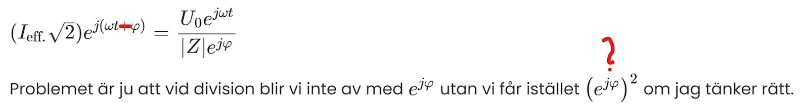 Om jag har förstått det rätt kan man räkna med att den komplexa strömmen, låt oss kalla den , ges av för en ström . Realdelen av ger då . Stämmer det?