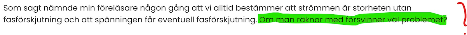 Jag tror att vår föreläsare har sagt att vi "bestämmer" att strömmen alltid har fasförskjutning 0. Om man räknar så och ger fasförskjutningen till spänningen istället, så att vi har , så blir det ju rätt.