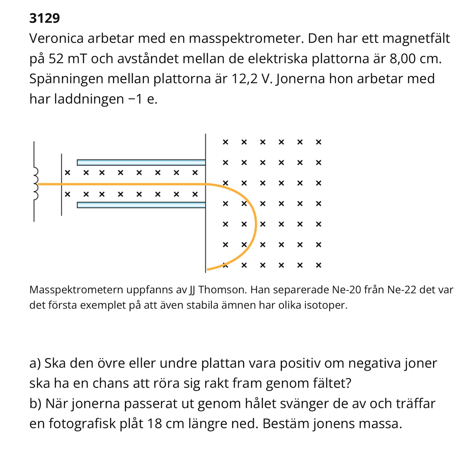 Hur besvarar man fråga b). Jag använde metoden från Impuls fysik 2 boken som angav att att först ta Fm=qvB Fe =q(U/d), Fm=Fe. V är då V=U/dB , sen att Fm är centripital ger att qvB=mv2/r m=qrB/v