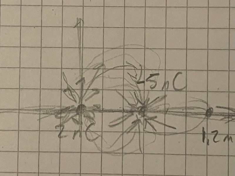 Så borde jag använda mig av F=14πε0×qr², för i så fall blir det för den första ca 449,4 och för den andra -124.83 och sedan subtraherar jag dem eftersom de attraherar varandra. Då får jag 574,23 N/C.