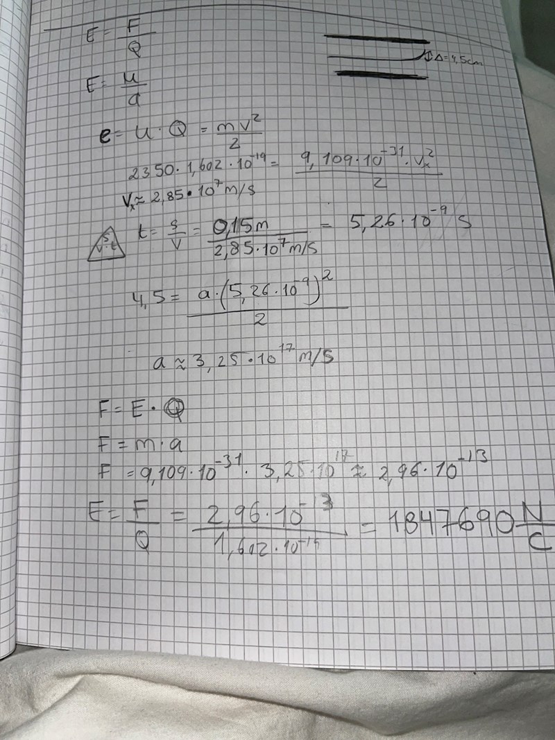 I ett laboratorium ska man styra en stråle med kloridjoner (de har laddningen 1e-.). Först accelereras de av en spänning på 2.35 kV in i ett elektriskt fält som är vinkelrätt mot jonernas rörelseriktning. Fältet är 15 cm långt och under sin tid i fältet ska jonerna hinna avvika 4,5 cm uppåt. Hur stor ska den elektriska fältstyrkan i fältet vara?