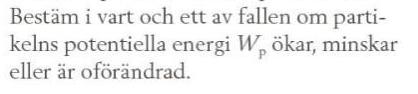 A : En positiv partikel, fältet går fr. + t. -, dvs neråt, A går neråt -> sedan blir jag lite osäker ska jag tänka att höjden minskar och att Wp minskar därmed eller ska jag tänka att den ökar då båda går åt samma håll?
