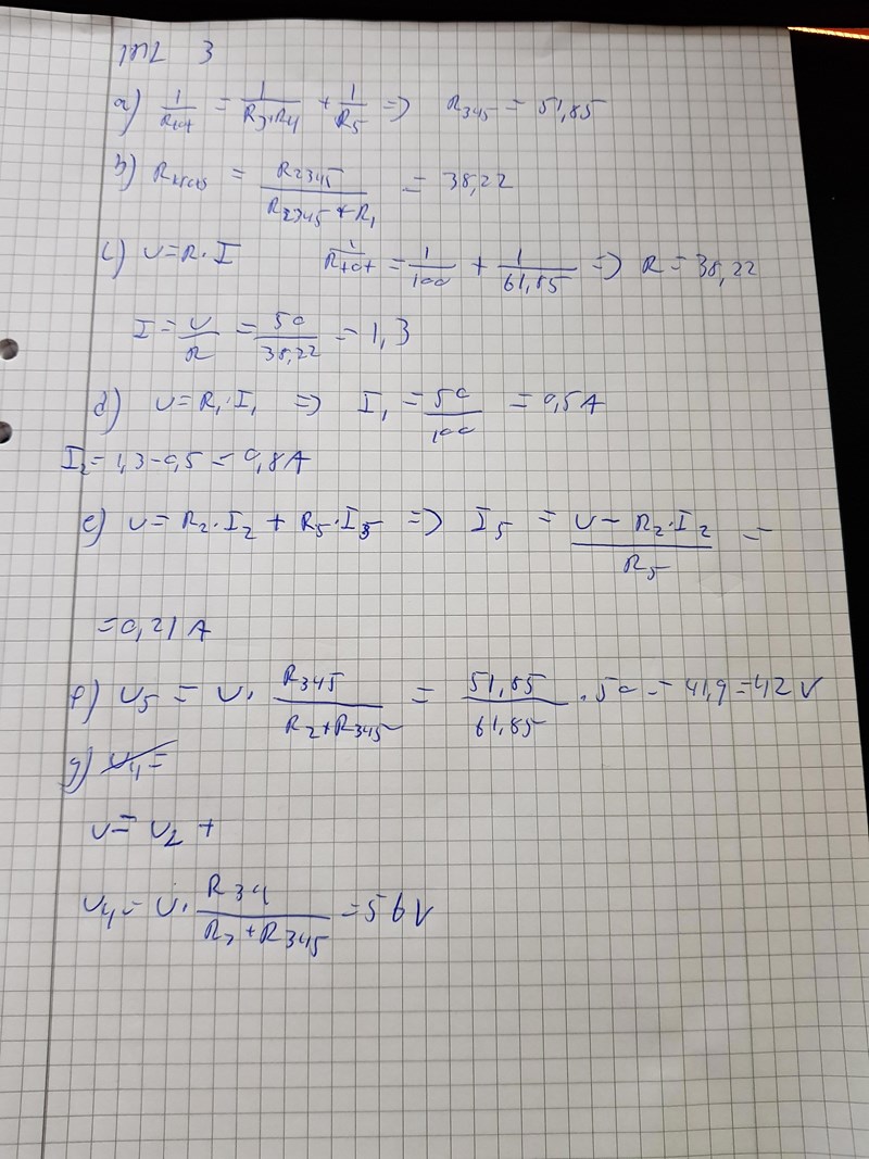 Eftersom de är över R4 borde inte de bli samma som i f) eftersom R5 och R4 är parrallel kopplade?