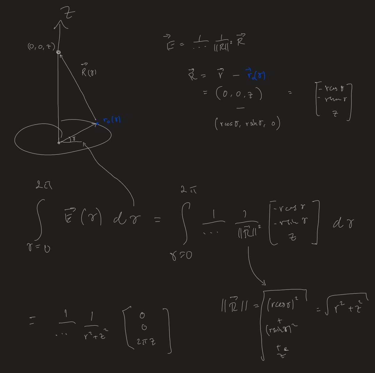 Qetsiyah skrev:Jag parametriserar ringen med variablen delta, delta går från 0 till 2pi. E fältets bidrag pga varje litet linjesegment är lika med integranden i första integralledet. Jag skriver ut vad elektriska fältet är i det andra ledet. Jag räknar ut att absolutbeloppet av R är sqrt(r^2+z^2) m.h.a. trigettan. Jag integrerar vektorn komponentvis, de två första blir noll. Den tredje blir lika med 2pi*z.
