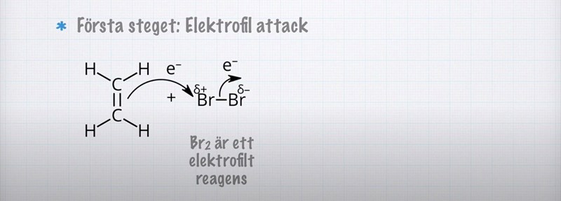 1 ) först attackerar nukleofilen (eten) elektrofilen (delta positiva bromkärnan).