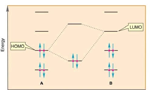 Kan det vara så att du blandar ihop det hela och tänker att HOMO och LUMO sitter på samma molekyl? Så är det inte. Eller ja, varje molekyl har en av varje men vid en kemisk reaktion är det LUMO på en molekyl som reagerar med HOMO på en annan molekyl. Om jag har en elektron högt upp i min trappa så kan den hoppa ner till en ledig plats längre ner på din trappa, eller snarare den gemensamma trappan som uppstår när molekylerna reagerar.