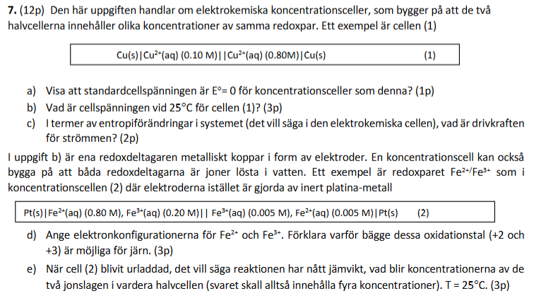 I a) uppgiften valde jag att beräkna halvcells reaktionerna, dvs Ekatod och Eanod och sedan ta Ekatod -Eanod och det blir ju då 0. I och med att det vare en "visa att" och inte "förklara att".