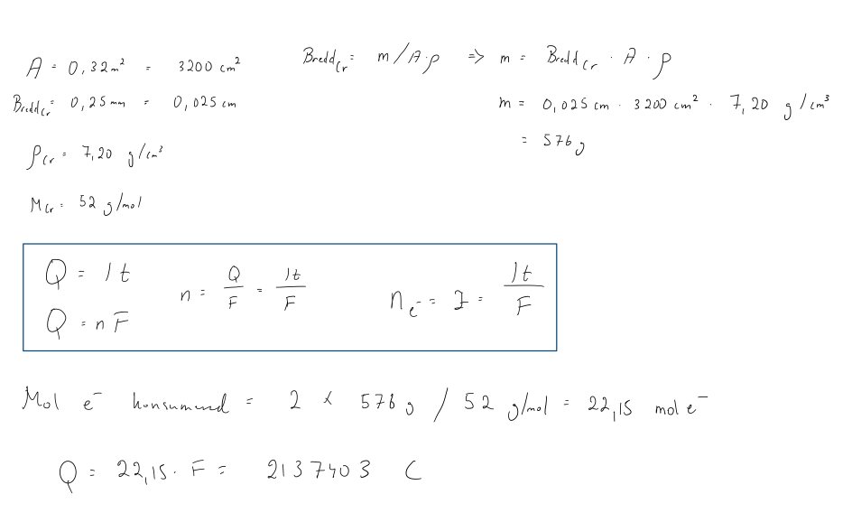 FRÅGA: Vilken elektrisk laddning behöver överföras för att elektrokemiskt belägga en plåt med arean 0,32 m2 med ett krommetallskikt vars tjocklek är 0,25 mm? Krombeläggningens densitet är 7,20 g/cm3. Elektrolysen utförs från en lösning som innehåller kromatjoner, CrO42-.