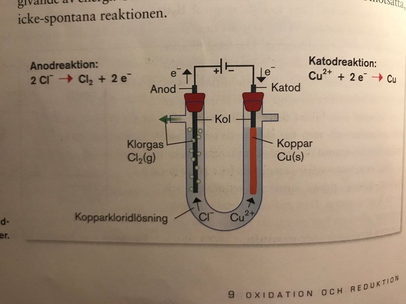 Man kallar den elektrod som man har kopplat till batteriets pluspol för anod. Anoden är alltså positivt laddad, d v s den drar åt sig de negativt laddade kloridjonerna, som lämnar ifrån sig en elektron var och blir till klorgas. Elektronerna "sugs in i" batteriet.