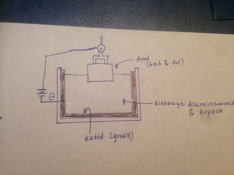 Här reduceras det. Al reagerar med elektronerna från anoden. Men jag förstår inte riktigt varför det händer. Hur spelar Aluminiumoxid in i denna reaktion? Borde det inte vara grafit?