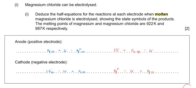Mitt svar är i blått, rätt svar är i rött. Förstår inte riktigt felet, magnesium har lägre elektriskt potential än klor (-2.37 vs +1.36) , borde den inte då oxideras?