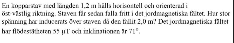 Då tänkte jag att börja med att jag ritar en figur som beskriver vad inklination kan vara och sen se vilken del av den jordmagnetiska fältvektorn ger en spänning i den fallande staven. Men jag vet inte hur jag ska rita det