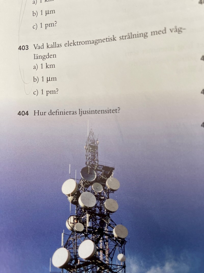 Jag undrar varför svaret i 403 a är radiovågor , dvs låg elektromagnetiska fält. Och varför svaret i b ska vara infrarött ljus. Varför ska det vara just infrarött ljus? Ultraviolett ljus har ju också våglängden 1mikro meter?