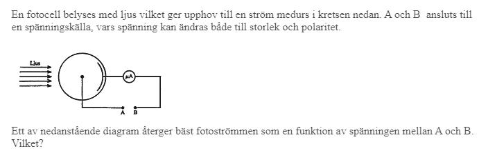 Det jag inte riktigt begriper är hur jag ska veta om spänningen som tillförs bidrar till eller motverkar strömmen från den fotoelektriska effekten? Jag tänker spontant att den minskar, men när jag ser facit blir tanken att spänningen kanske orsakar en ström i samma riktning som den fotoelektriska effekten? Hur ska jag tänka?