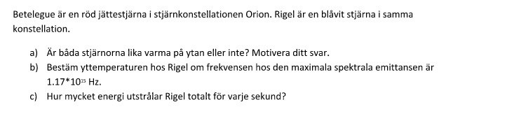 a) blåvita stjärnan är varmare pga blått ljus har kortare våglängd.