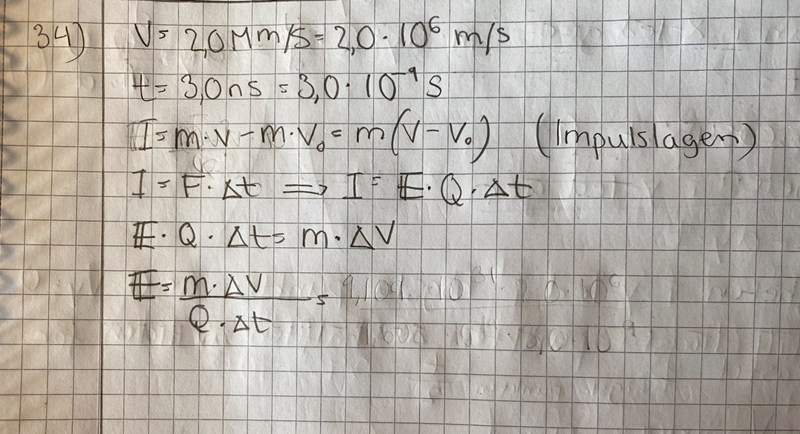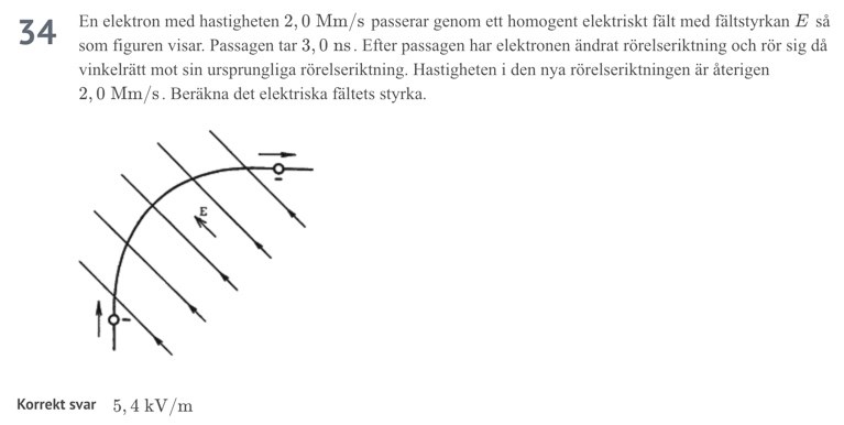 (Vinkeln mellan E och den ursprungliga rörelseriktningen hade gärna fått vara angiven i uppgiften. Nu måste man måste anta att vinkeln är 45 grader)