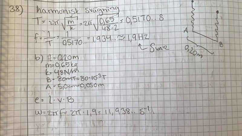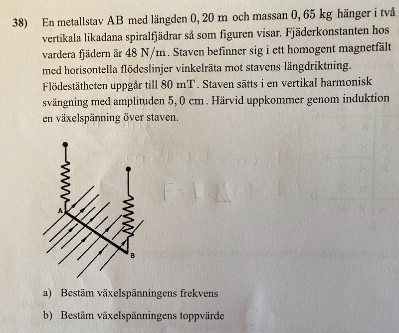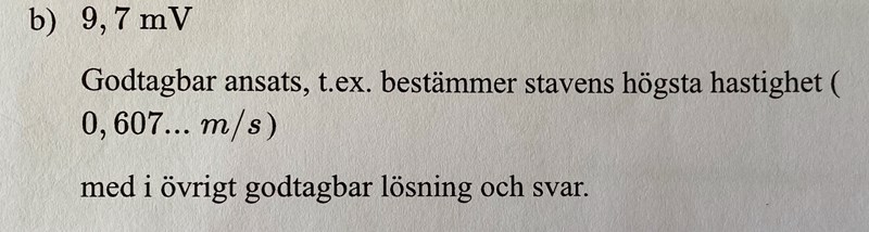 Hur gör man på b)? Jag har löst a) och funderar på om man ska använda frekvensen till något? Jag vet inte hur man bestämmer stavens högsta hastighet. Och jag gjorde något försök med att bestämma vinkelhastigheten ifall man ska använda det i någon formel för harmonisk svängningsrörelse kanske?