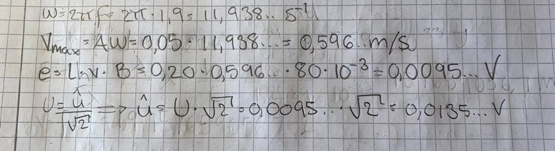 Okej, men när den högsta hastigheten är bestämd, beräknar jag den inducerade spänningen och sedan toppvärdet för spänningen, men det blir ändå fel.