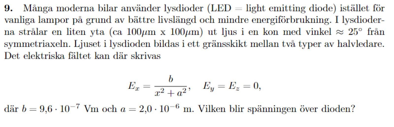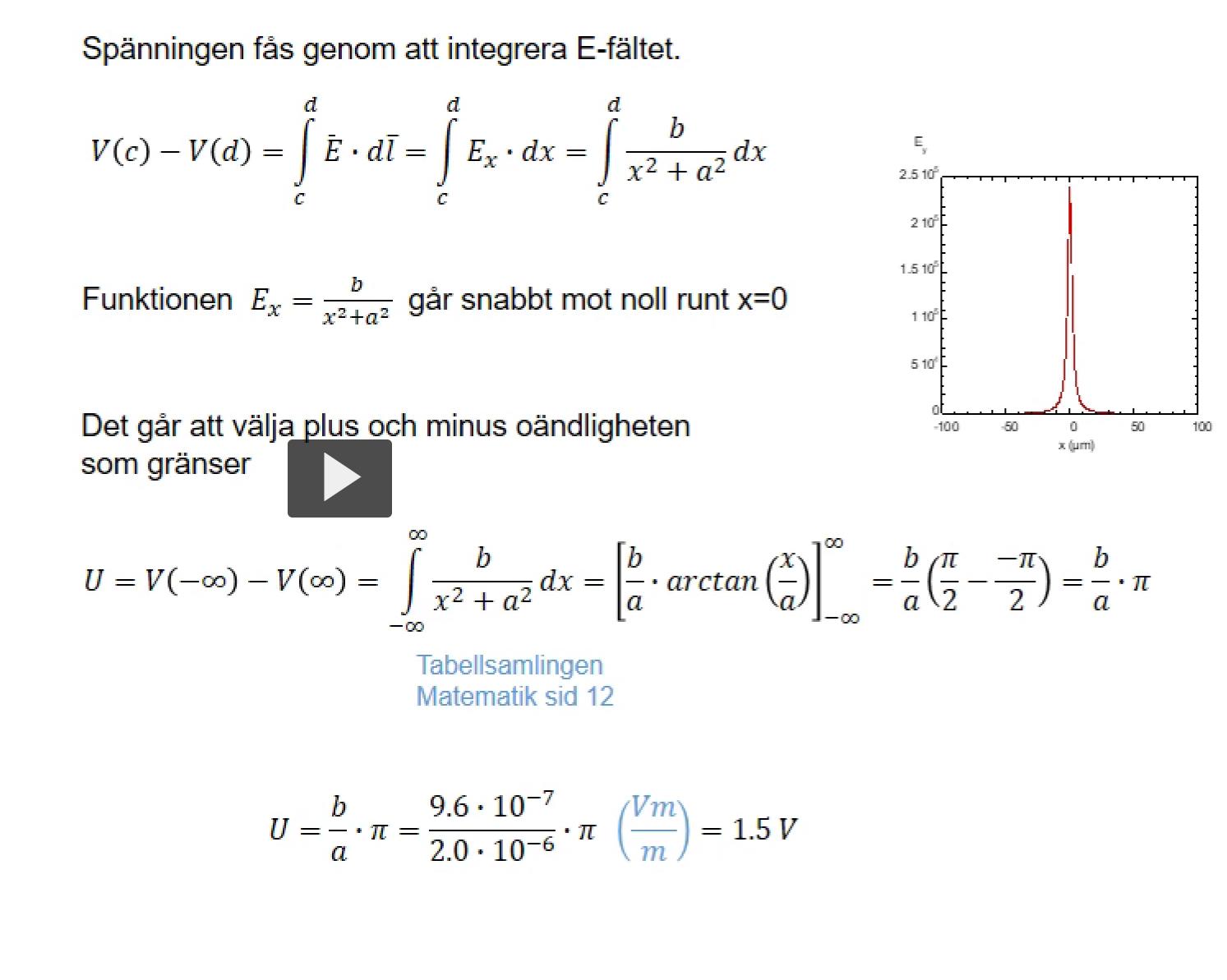 Hej! Jag förstår inte hur jag ska lösa den här uppgiften. Min tanke är att integrera E_x över en sträcka d i gränsskiktet för att få potentialskillnaden (dvs spänningen). Men jag vet inte hur jag ska ta reda på avståndet d? I en facit-video står det att man ska integrera från minus oändligheten till positiva oändligheten. Men jag förstår inte varför? Vad står x ens för i E_x? Är det avståndet i gränsskiktet?