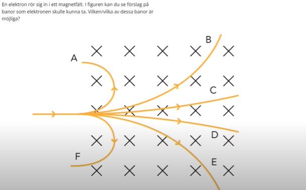 Vi vet inte hur starkt magnetfältet är jämfört med elektronens laddning 8för att uttrycka sig lite ovetenskapligt). Om magnetfältet är jättestarkt kommer elektronen att svänga mycket, så det bilr en liten radie som i f. Om magnetfältet är svagt kommer elektronen bara att svänga lite, som i d. Om magnetfältet är mittemellan kommer elektronen att svänga halvmycket, som i e. Någon av banorna borde vara korrekt, men vi vet inte vilken av dem - men vi vet att det inte är a, b eller c.