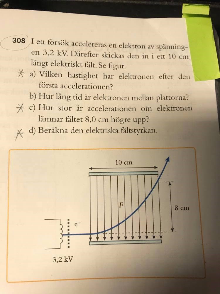 I ett försök accelereras en elektron av spänningen 3,2 kV. Därefter skickas den in i ett 10 cm långt elektriskt fält.
