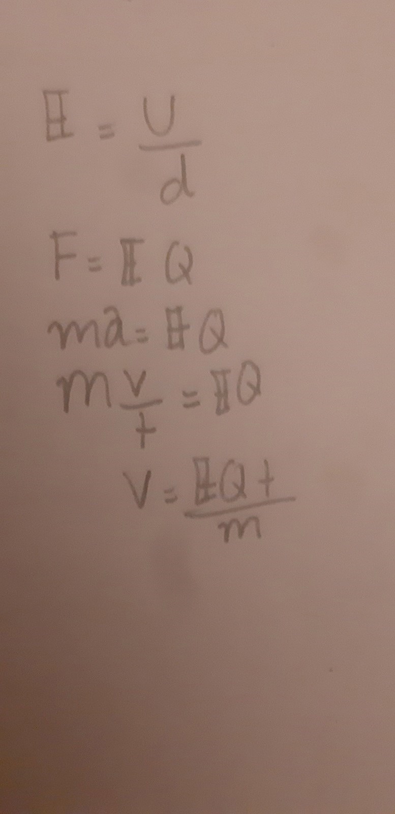 Om d ökar, minskar elektriska fältet vilket innebär att även hastigheten uppåt minskar, detta innebär att den hinner ej åka uppåt lika mycket då hastigheten framåt är lika stor. Låter det bra?