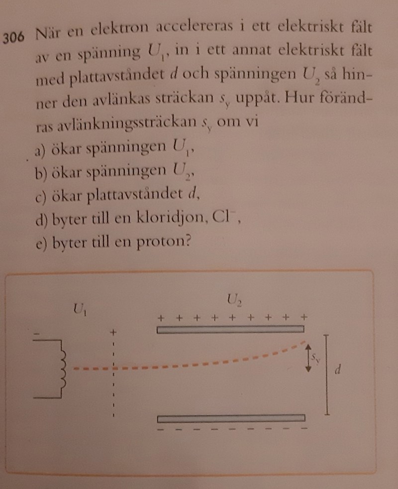Fast på d) hastigheten framåt minskar om massan ökar och då hinner väl jonen åka upp mycket mer vilket innebär att avlänkningssträckan ökar? Fast facit säger att det minskar.