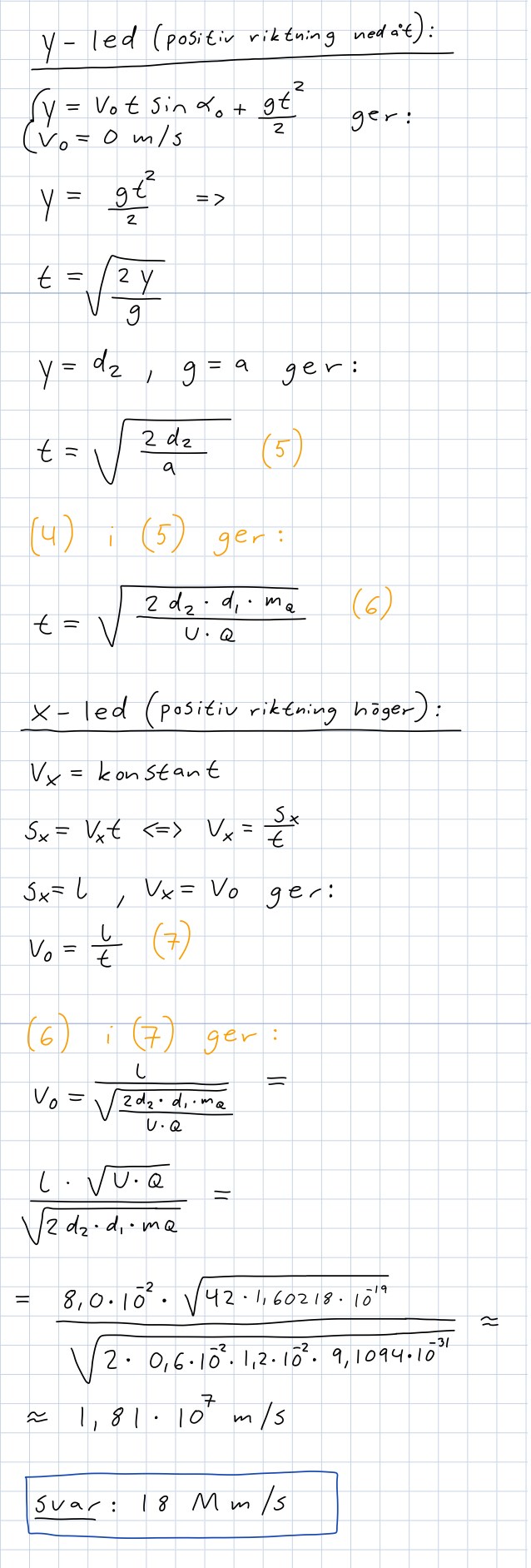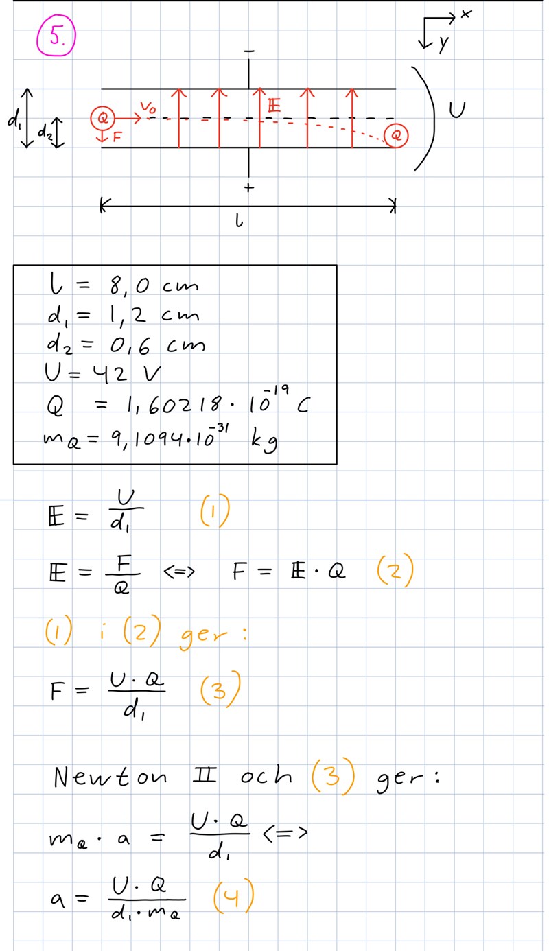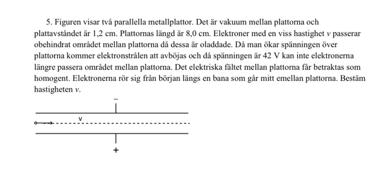 "Om accelerationen i y-led är så stor att elektronen böjs av så mycket att den når fam till den positivt laddade plattan innan den har hunnit ut ur fältet, kommer inte elektronerna att kunna passera omrädet mellan plattorna. Vi beräknar för vilken hastighet detta inträffar."