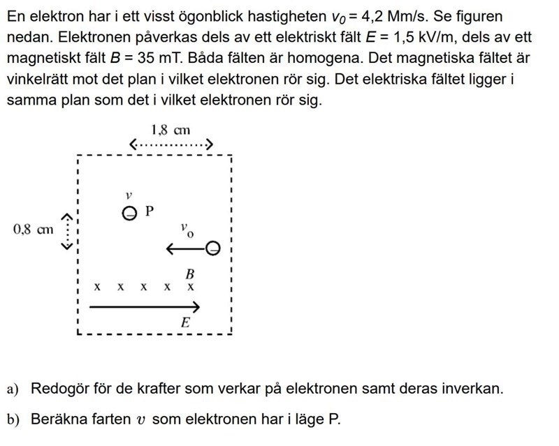 Elektronen rör sig vinkelrätt mot ett magnetfält och påverkas därför av en kraft i sidled, vilket håll? Hur stor kraft?