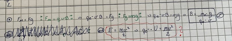 ”En elektron accelereras av spänningen 3V in i ett magnetiskt fält. Hur starkt ska magnetfältet vara för att den magnetiska kraften ska vara lika stor som gravitationskraften?”