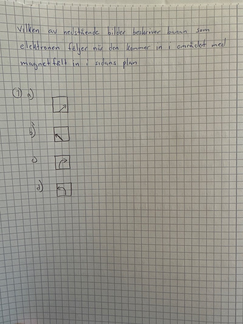 Jag undrar om c) (dvs kurvad åt höger ) är korrekt svar pga att elektron är negativt, magnetfältet är riktat inåt i skärmen och vänsterhandregeln