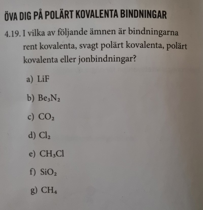 Hej! Hur ska man räkna ut detta för ämnet i e) uppgiften, alltså CH3Cl? Jag löser dom andra uppgifterna, för i dom är det ju bara om enskilda atomslag, men i e) så sitter ju klor ihop med en molekyl? Och man ju inte slå upp elektronegativteten för en hel molekyl i tabellen?
