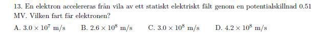 Elektronen tillförs en rörelseenergi lika stor som dess viloeneregi. Det betyder att vi måste räkna relativistiskt.