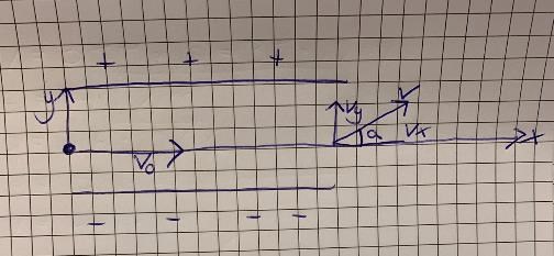 En elektron skjuts in i ett 15 cm långt homogent elektriskt fält med hastigheten 3,5 Mm/s. Den elektriska fältstyrkan är 140 V/m och riktad vinkelrätt mot elektronens rörelseriktning där den kommer in i fältet